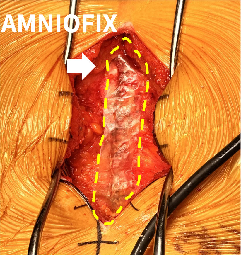 - The first 2 cm x 6 cm AMNIOFIX sheet was applied as a protective barrier to the exposed dura and tucked underneath the lamina and lateral recesses.
