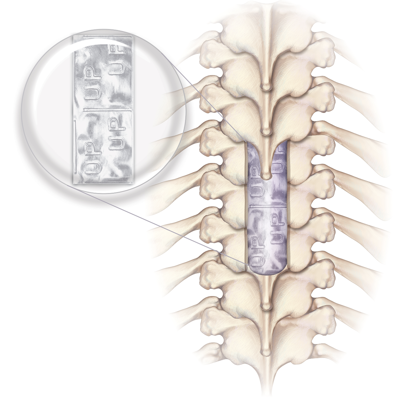 4 cm x 6 cm AMNIOFIX sheet was cut lengthwise into two pieces. The first 2 cm x 6 cm AMNIOFIX sheet was applied as a protective barrier to the exposed dura and tucked underneath the lamina and lateral recesses. |